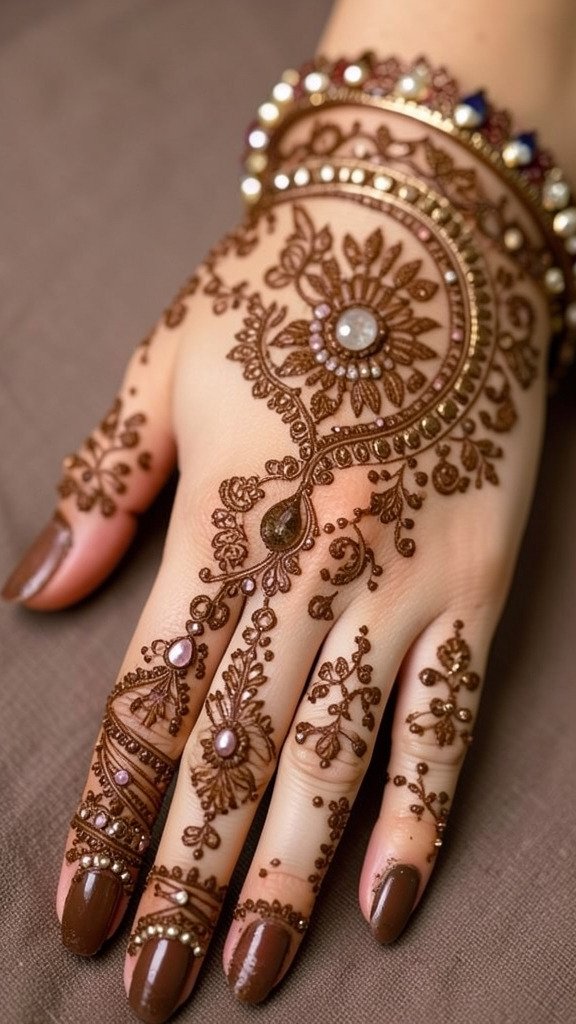This style mimics the look of actual hand jewellery called “haath phool” in Urdu where a central piece sits on the back of the hand with chains extending to each finger. In mehndi, this is recreated using fine lines running from a central motif (a mandala, flower, or geometric shape) to the base of each finger. The effect is stunning and wedding-appropriate. For baby boys, a simplified version with three finger connections rather than five looks proportional and neat on small hands.
