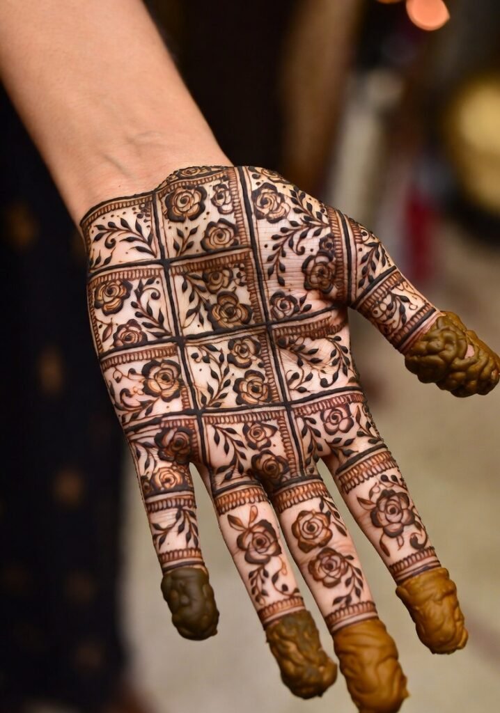 Manadala design are evergreen yet trending. A perfect circular pattern in the center of the palm creates a balanced and symmentrical look. Many viral maandi dejan photo posts highlights mandala art because of its simplicity and beauty.